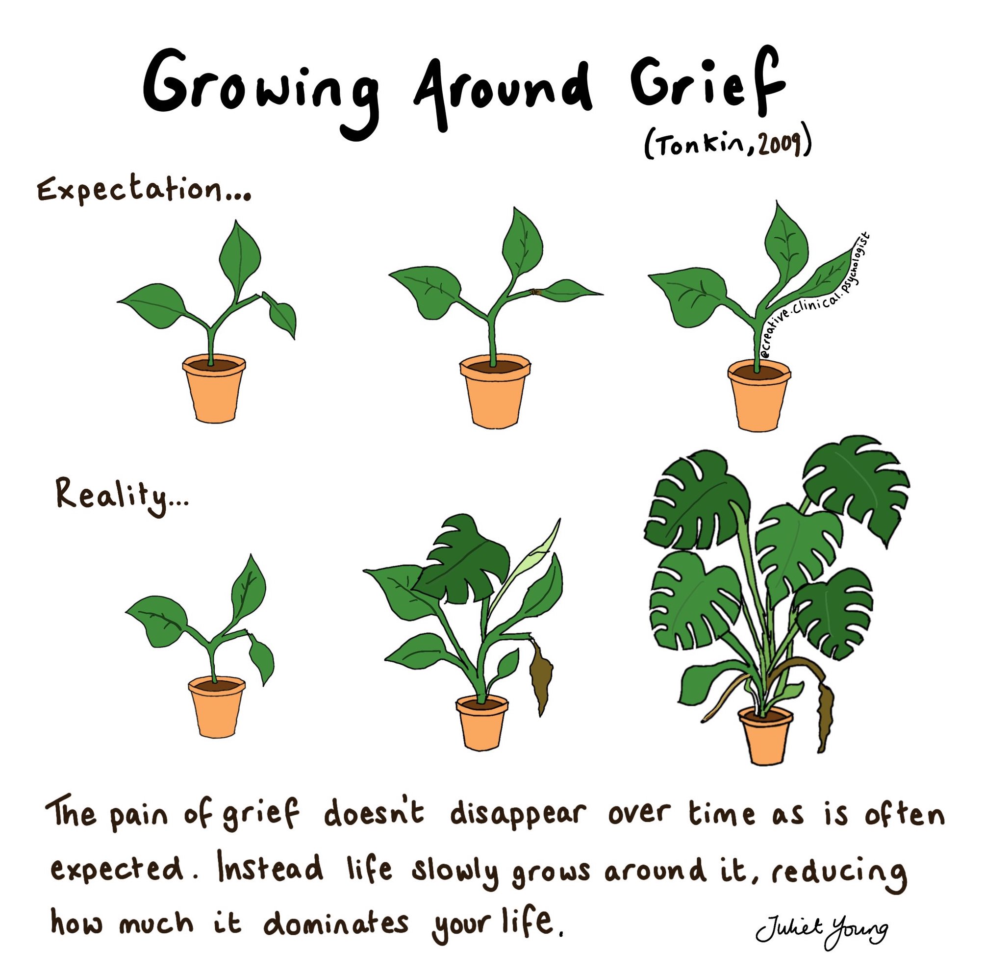 Grief shows up in those moments when we look for someone or something—even an aspect of ourselves—and find that it’s no longer there. These moments can be so destabilizing and painful at first, but they grow more familiar. The absence doesn’t go away, but we get used to it. According to Dr. Lois Tonkin’s model of grief, we learn to learn to grow and change around it.