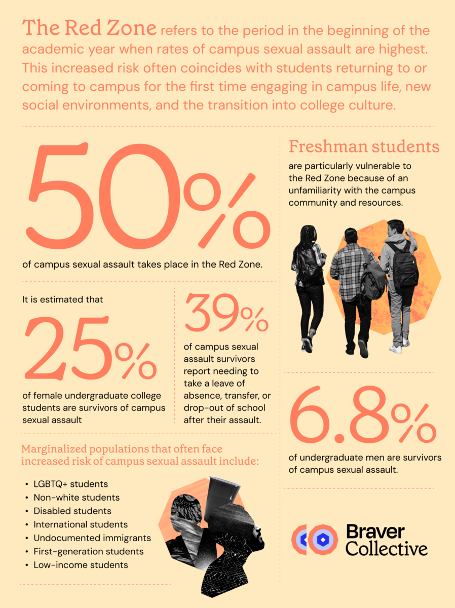 The “Red Zone” refers to the first six to eight weeks of the fall semester – the period when over 50% of college sexual assaults occur. This risk is particularly high for: