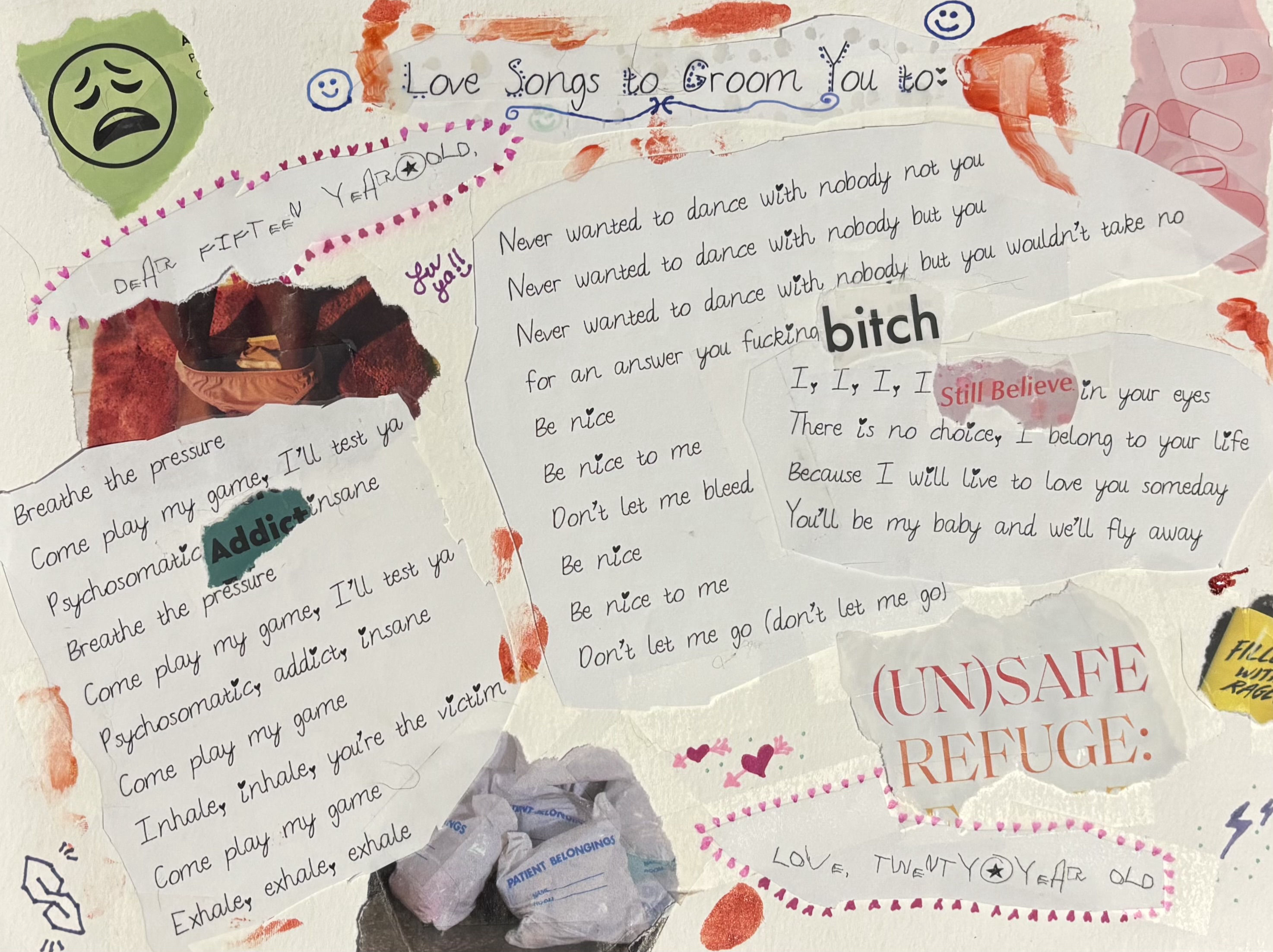 This piece explores how music can hurt and heal; how intentionality may or may not be present. The artist heard these songs repeatedly as a background to their abuse. At the time, these songs seemed to be just that - another cluster of songs (both separate and singular). A background track. The artist came to realize these songs shared more about this abuser’s psyche and proved a mixed warning. Now, the artist is able to enjoy these songs through reclamation - and despite the history they have with the songs, they have little meaning at all to the artist. They are background tracks to more meaningful things.
